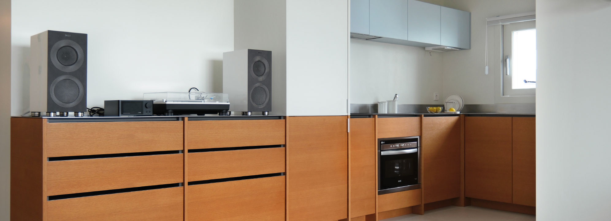 길게 펼쳐진 ㄱ자형 하부장과 그 중심에 놓인 키큰장이