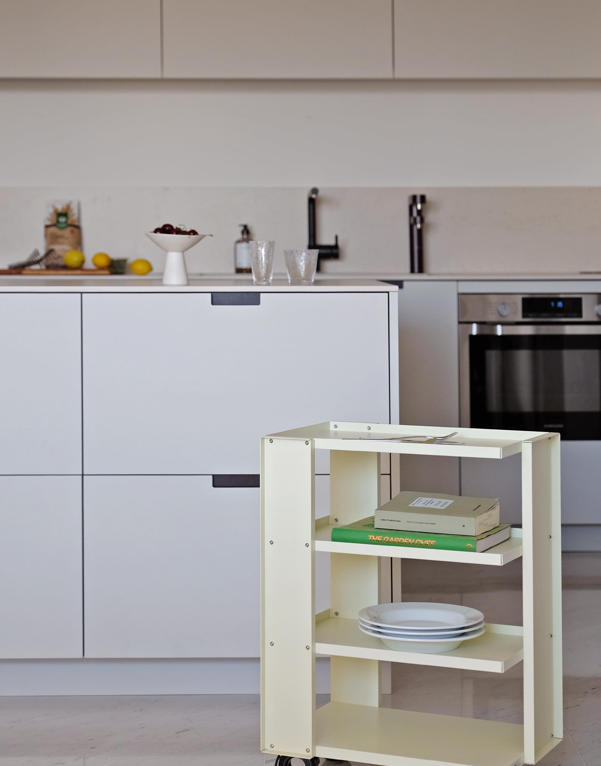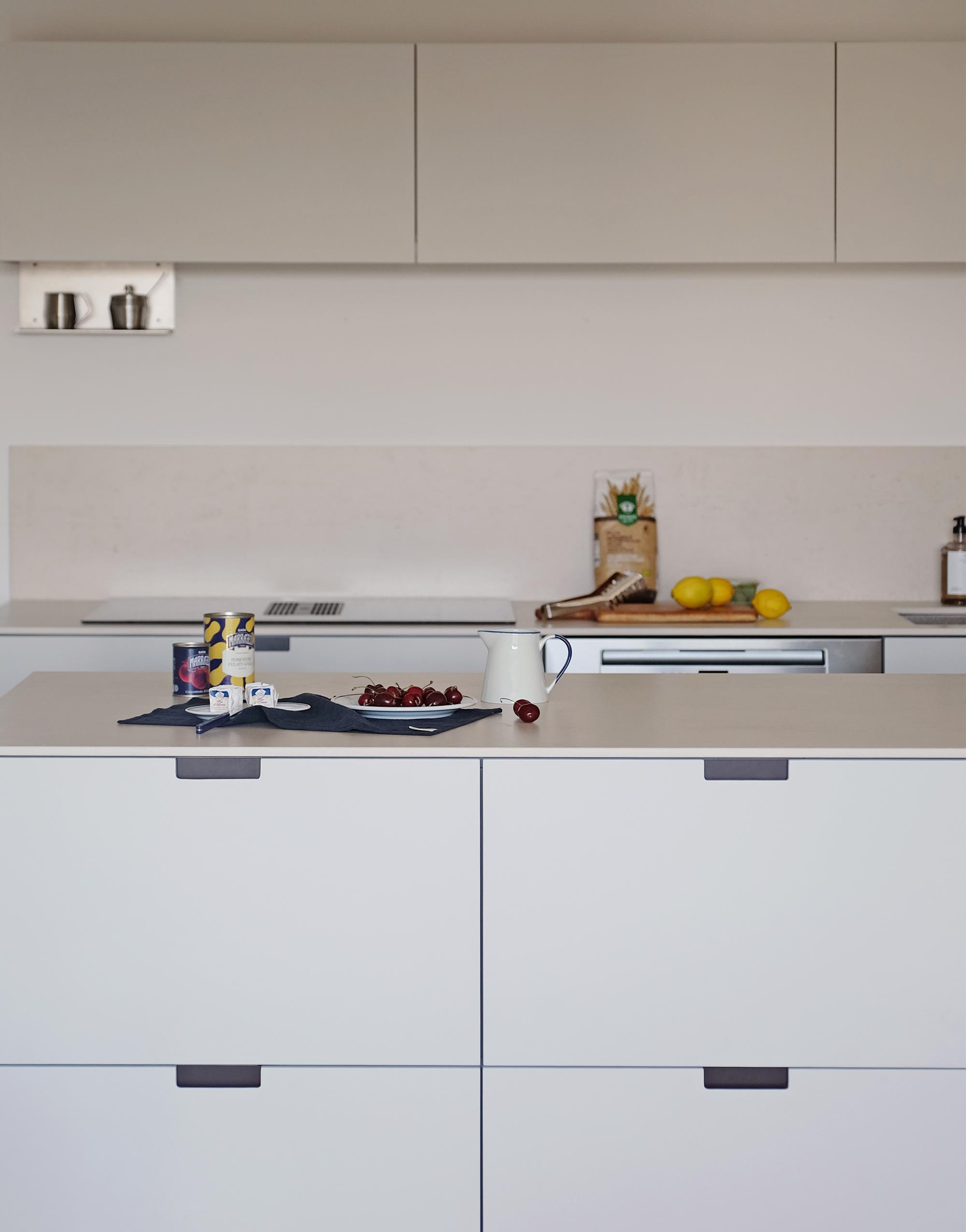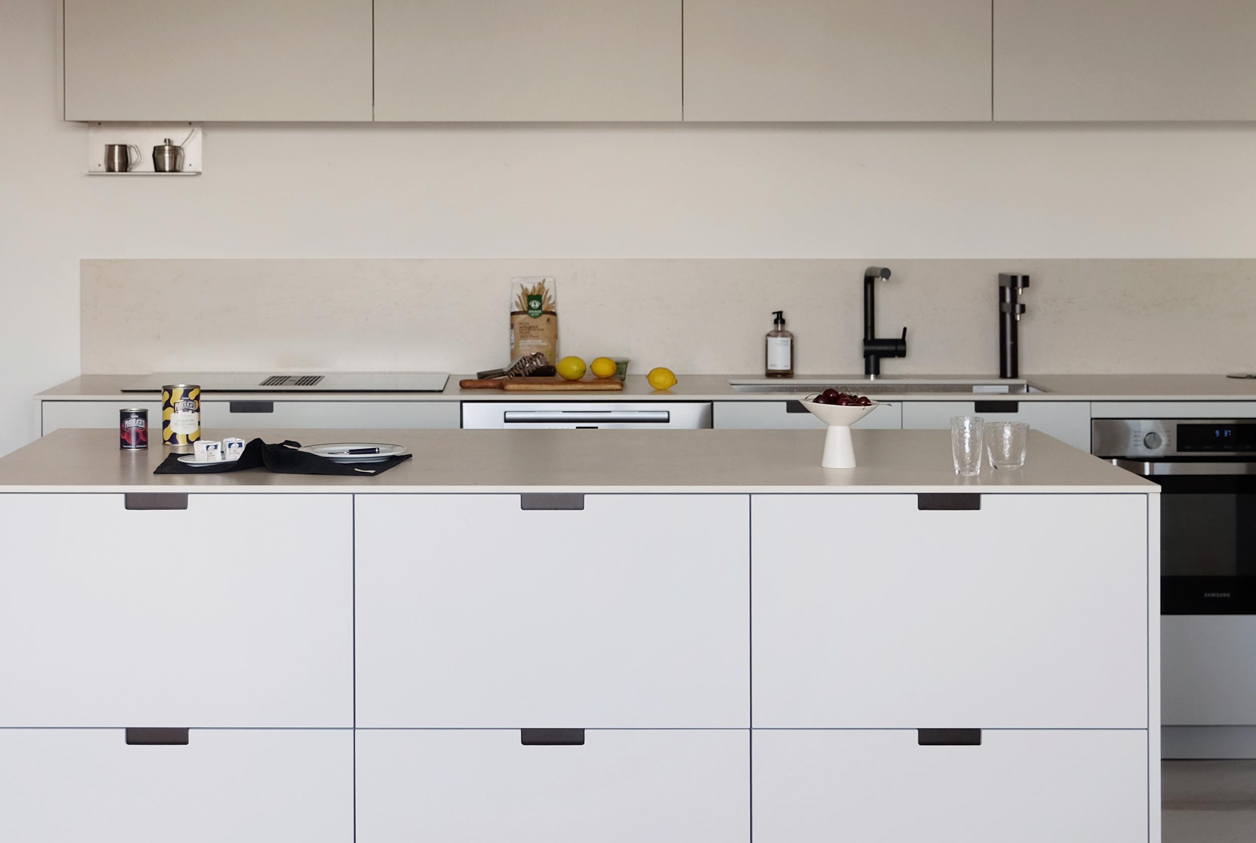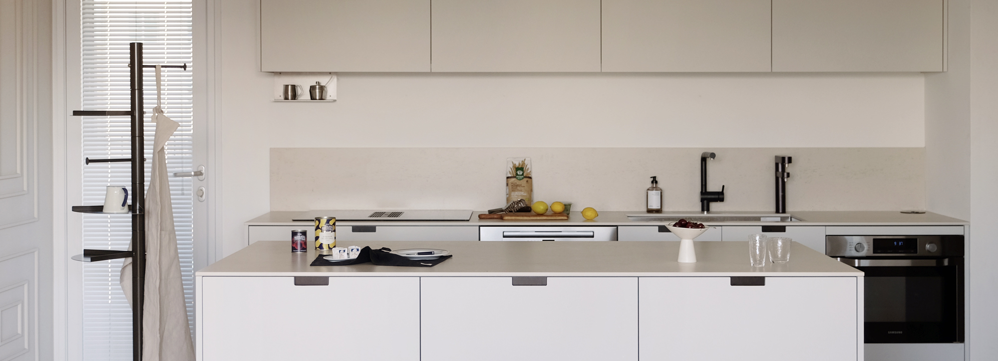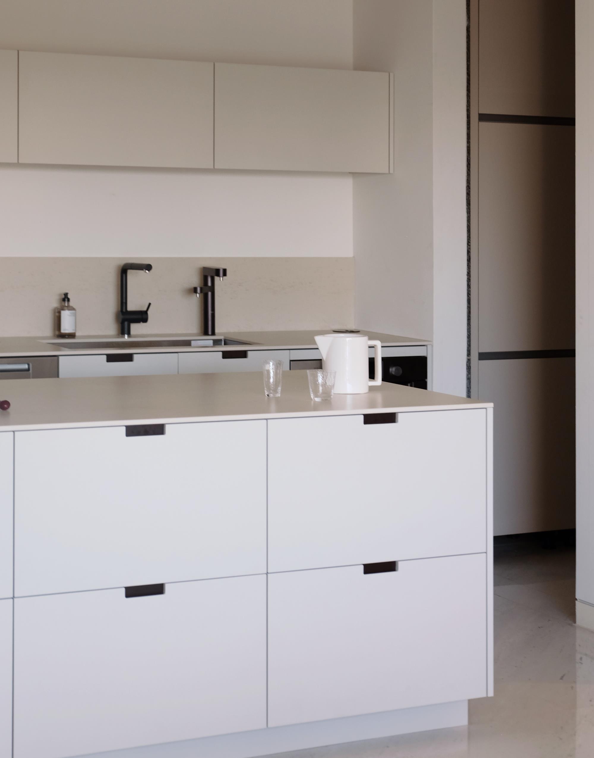 DB02-Project는 거실 → 키친으로 구조와 용도를 탈바꿈한 프로젝트입니다. ‘키친의 준비대가 넓으면 좋겠다’는 클라이언트의 의견에 불편함 없이 편하고 즐거운 키친이길 바라는 디자이너의 마음까지 담아, 넓은 아일랜드 키친을 포함한 11자 형 키친으로 설계되었습니다. 여유로운 백색의 공간에 튐 없이 스며들 수 있도록 연한 회색과 세라믹 상판을 선택하고 MMK의 상징적인 003 핸들을 더해 완성합니다.