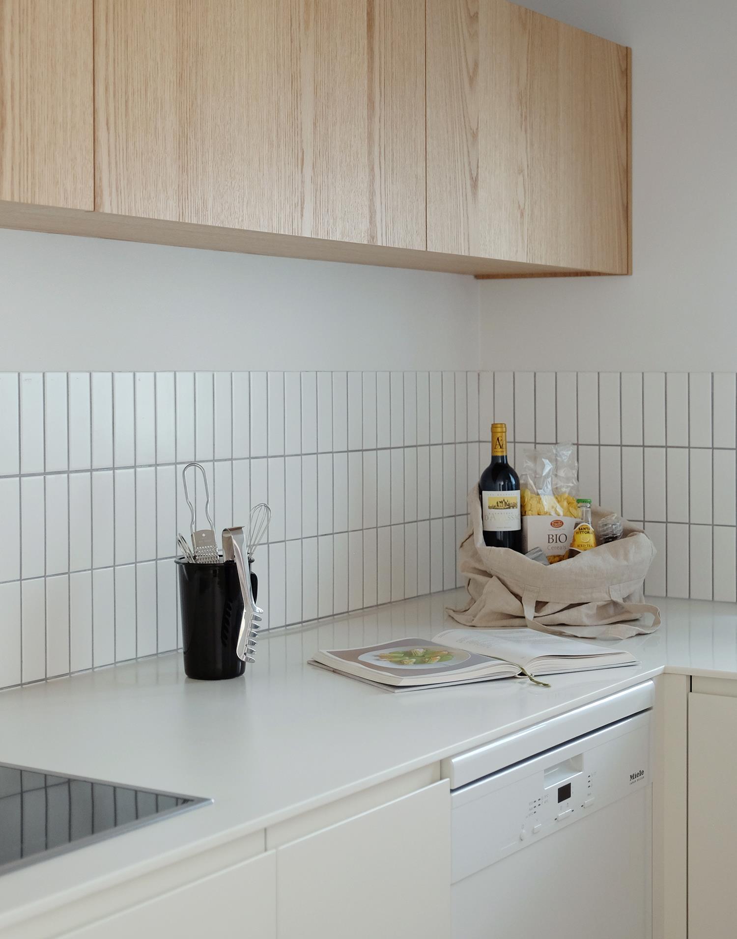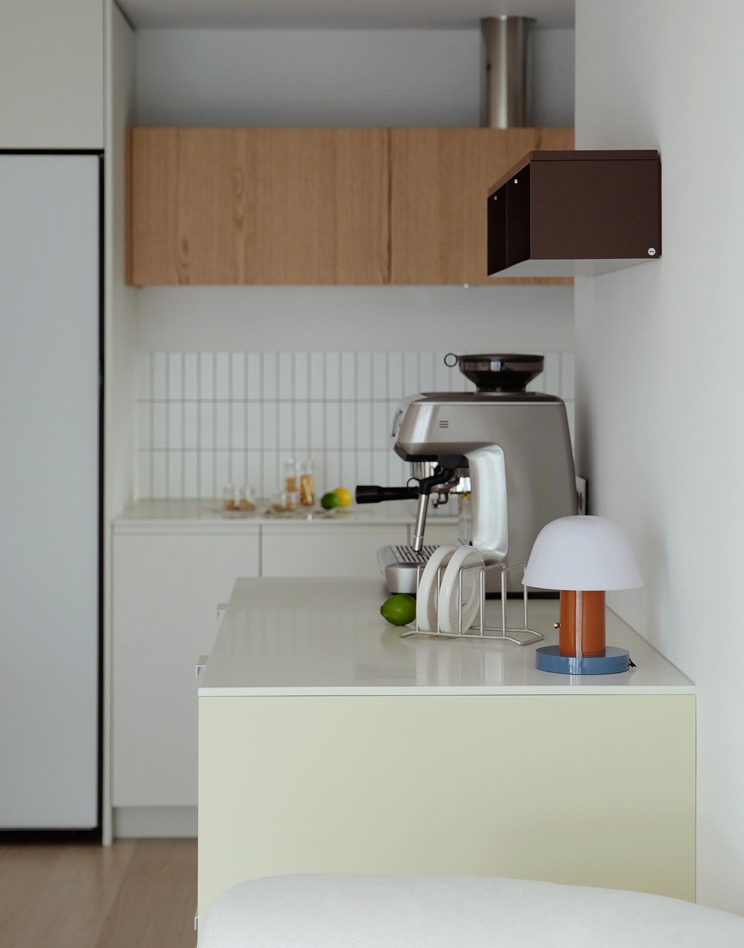 ㄱ자형 키친은 Color & Wood 매치로 안정감을 강조합니다.
