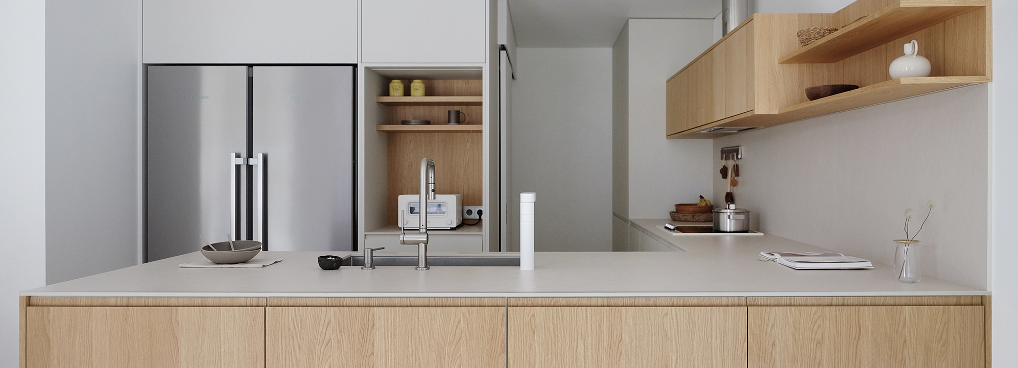 내추럴 화이트 오크우드와 베이지 세라믹 상판,
