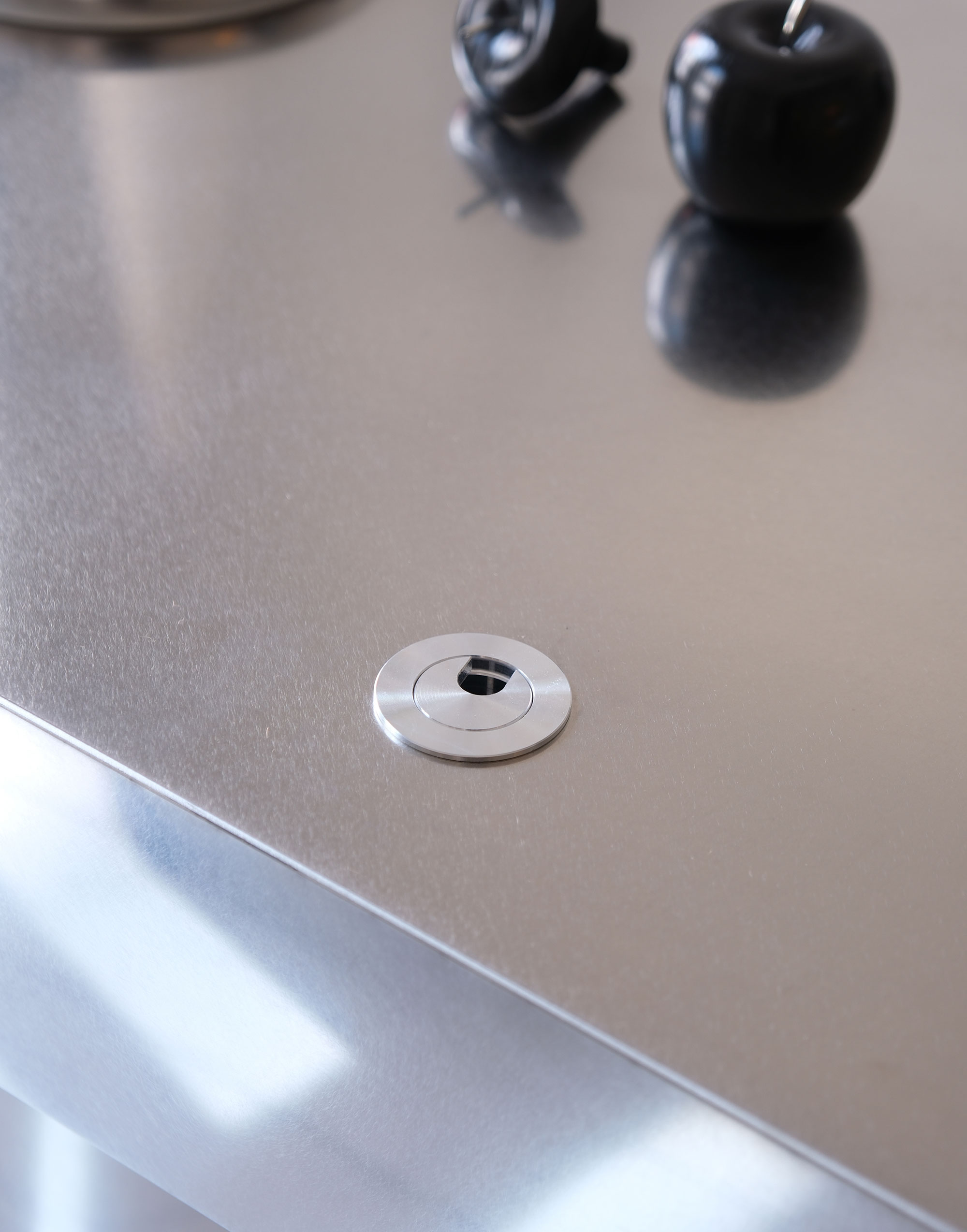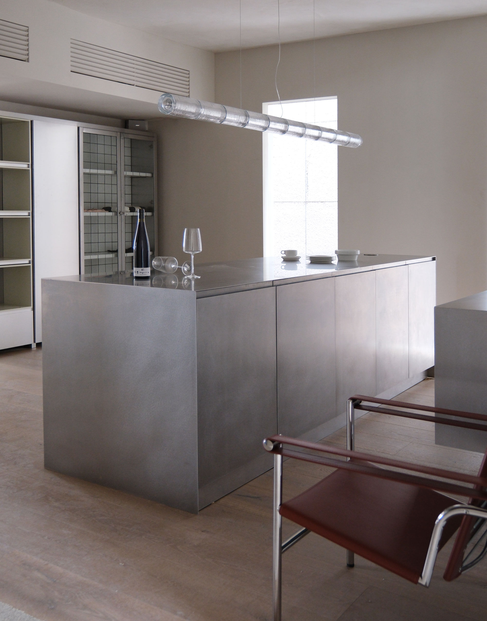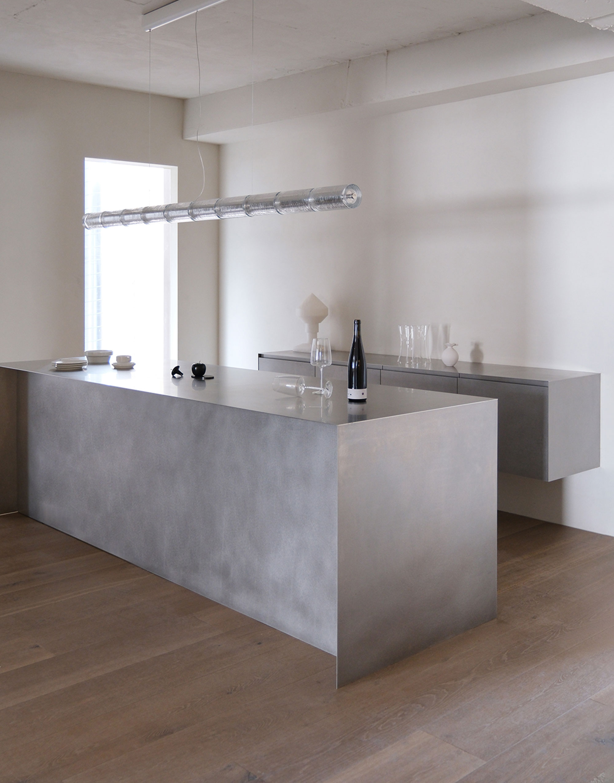 부드러운 배경과 대조되는 현대적인 메탈 키친