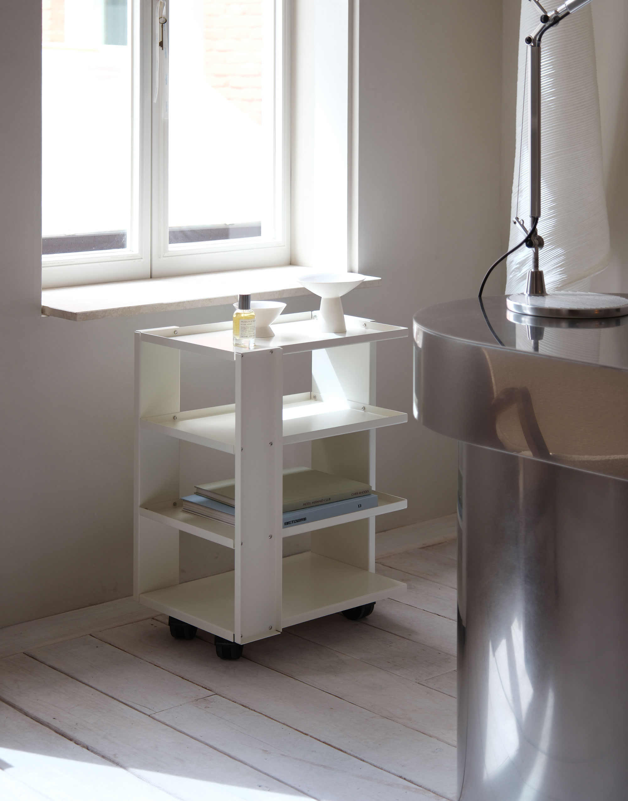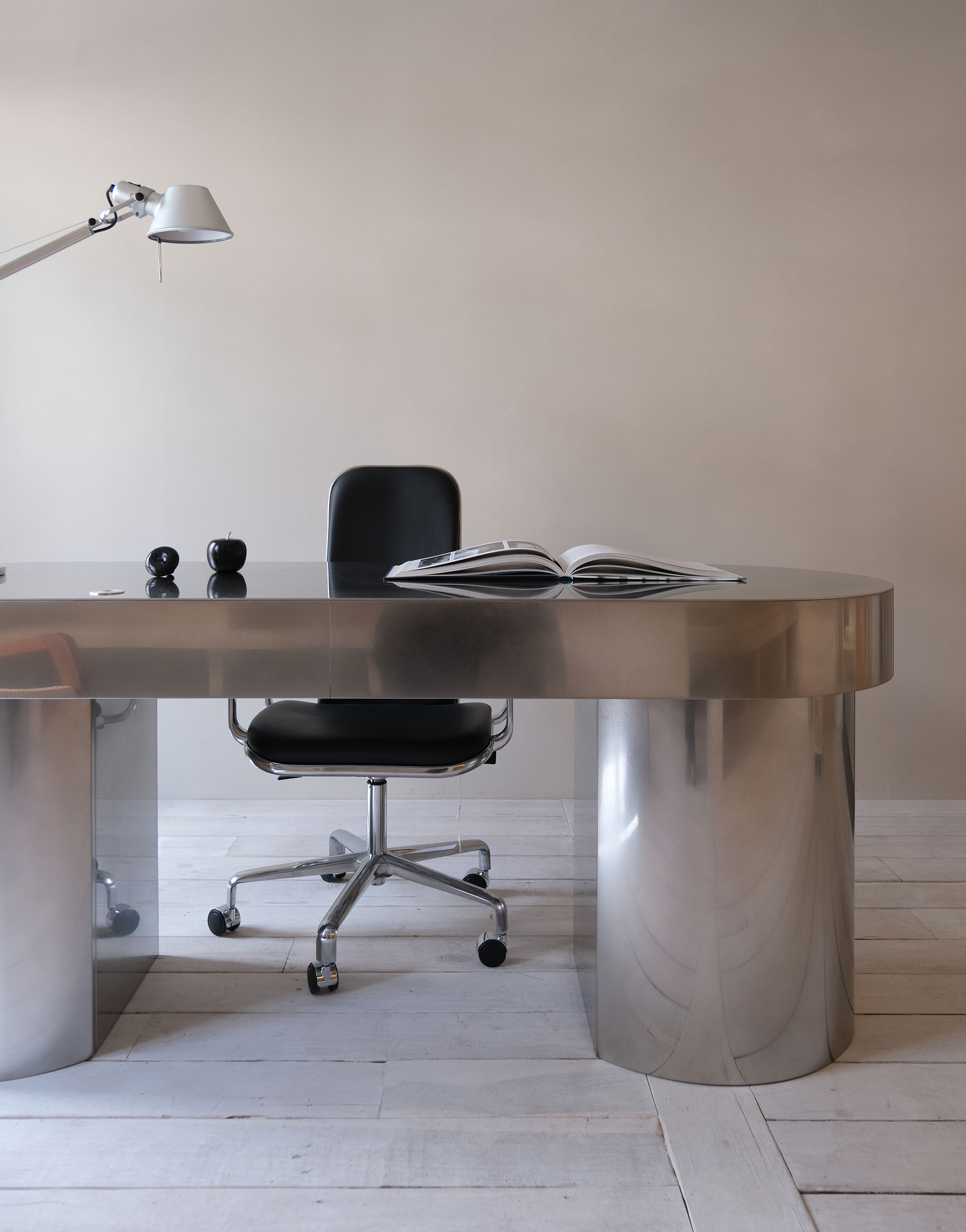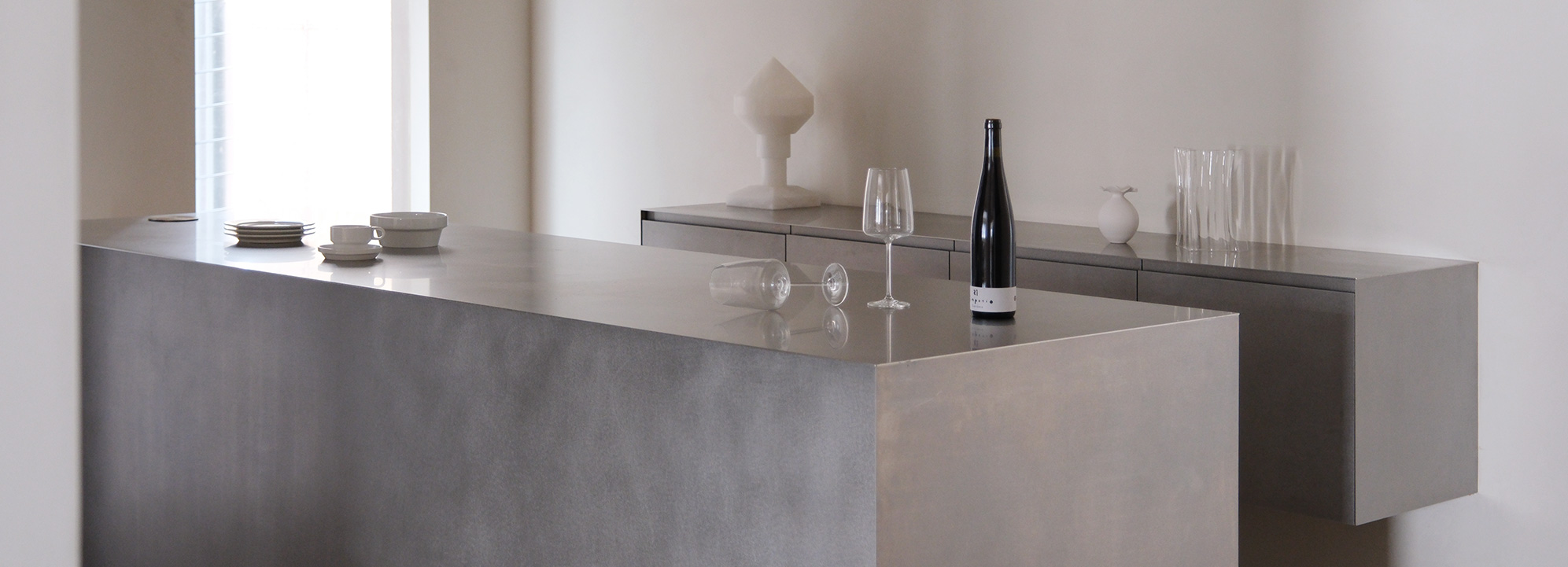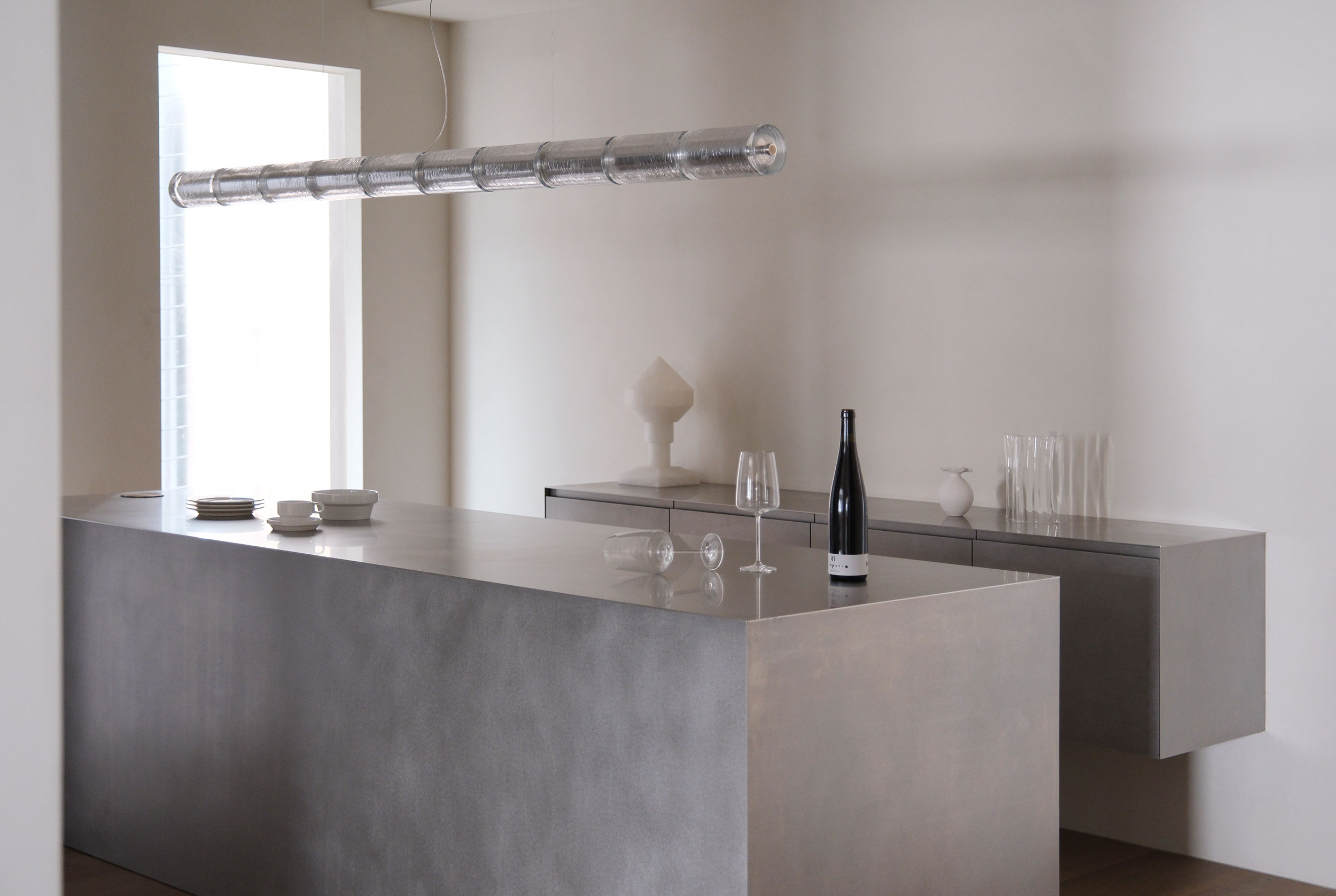 부드러운 배경과 대조되는 현대적인 메탈 키친