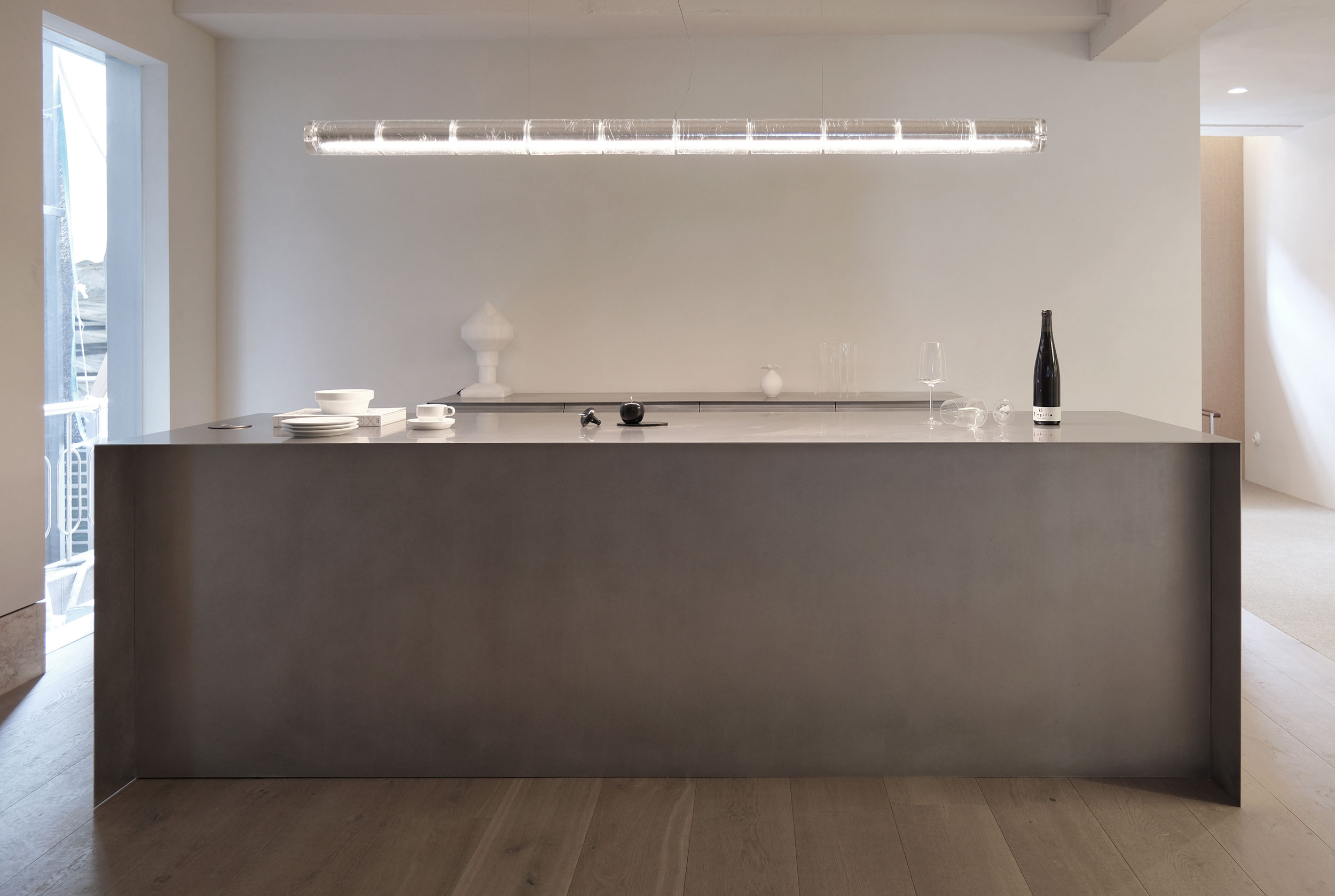 아일랜드와 공중에 띄운 벽 수납장 구성으로 선보이며
