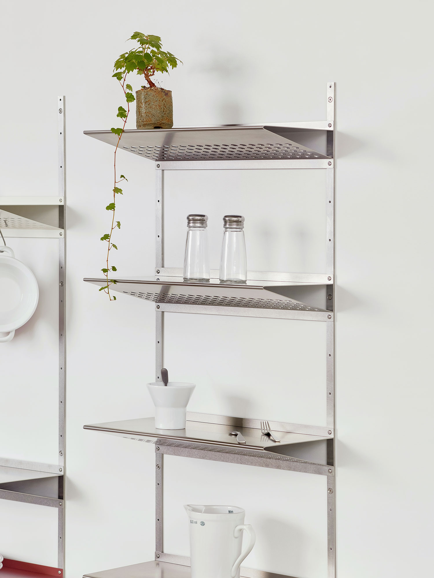 선반에 여러 모양의 키친웨어를 걸어나 계절의 식재료를 얹어