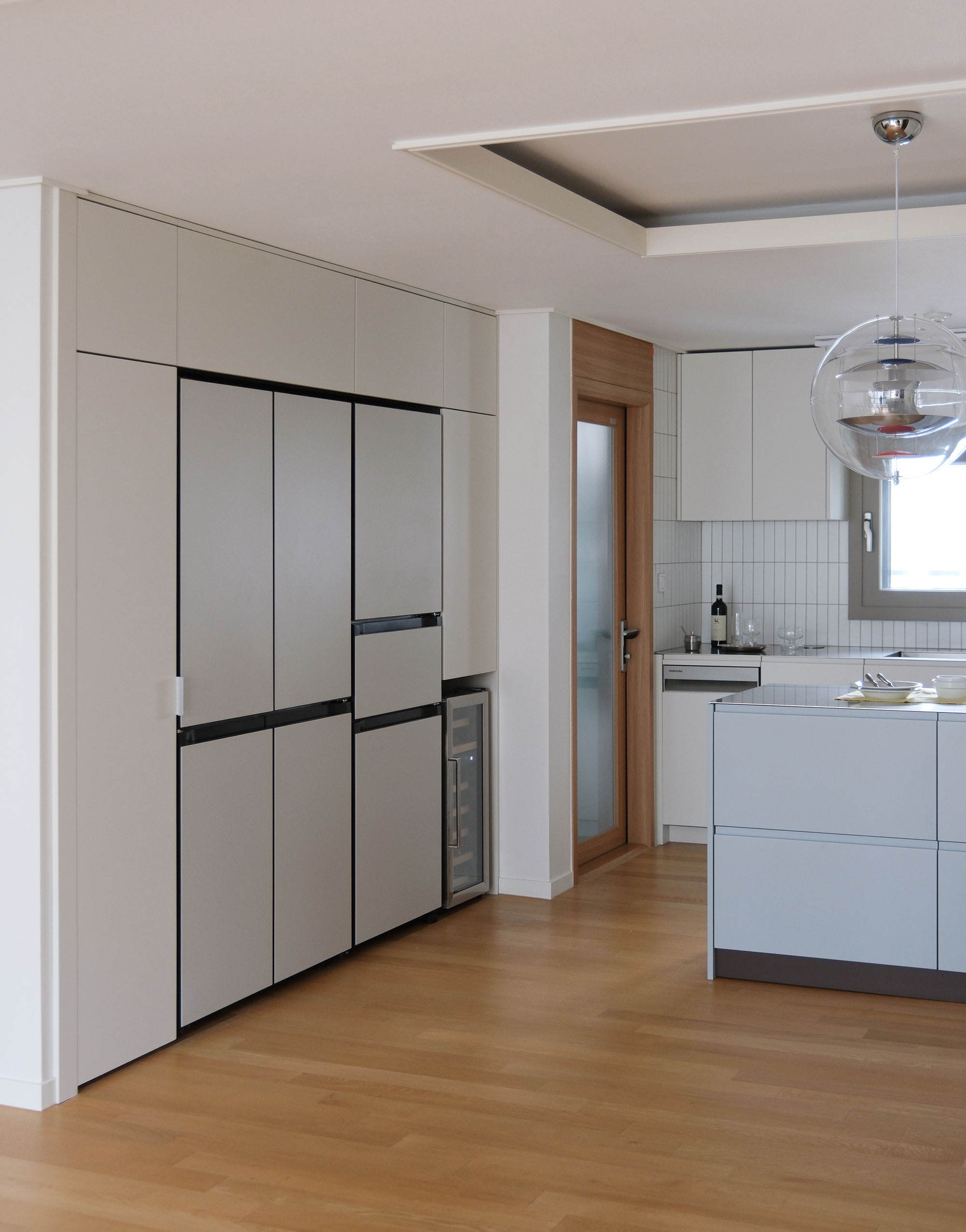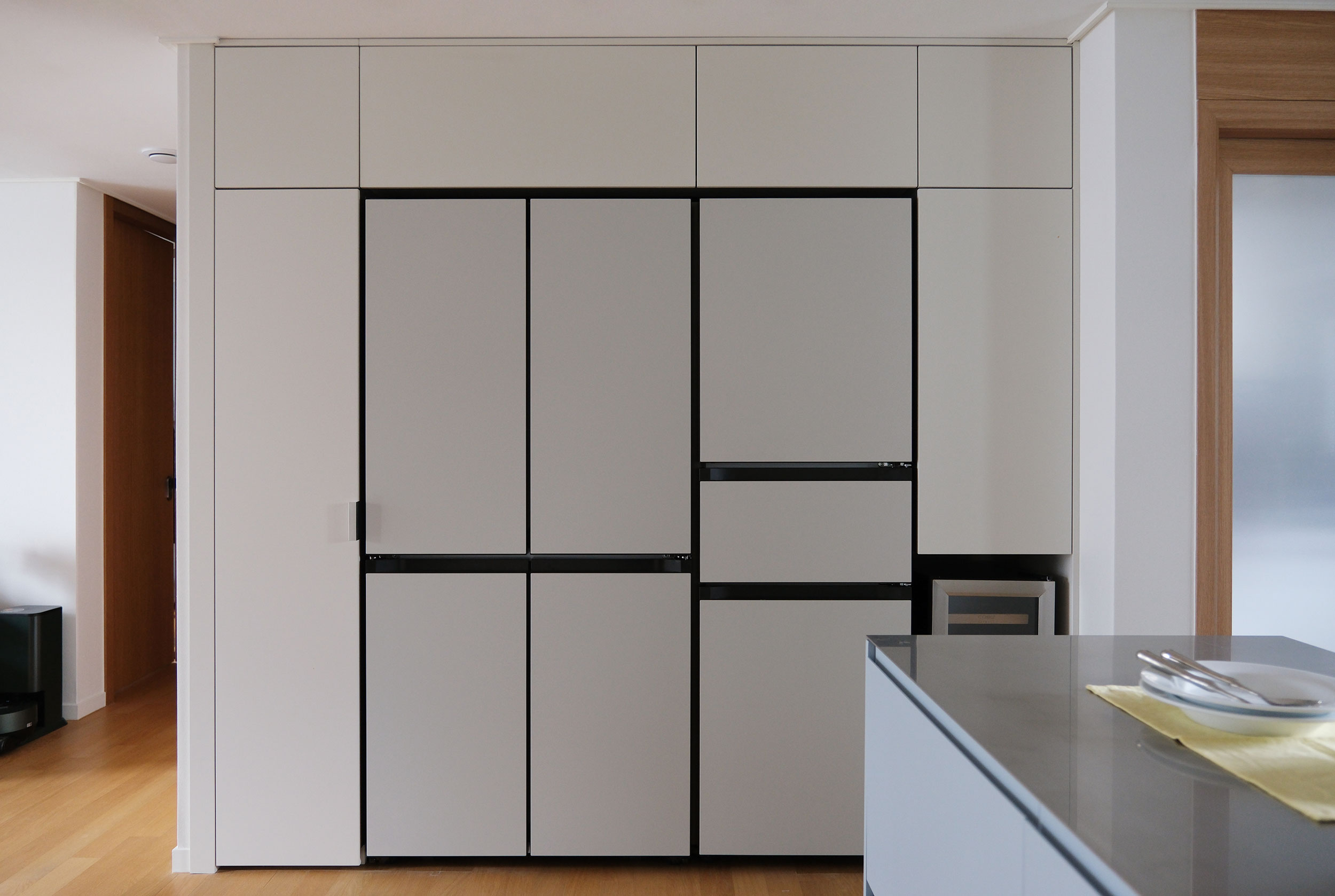 하나의 벽면에 냉장고 2대, 와인 냉장고, 팬트리, 와인 행거를