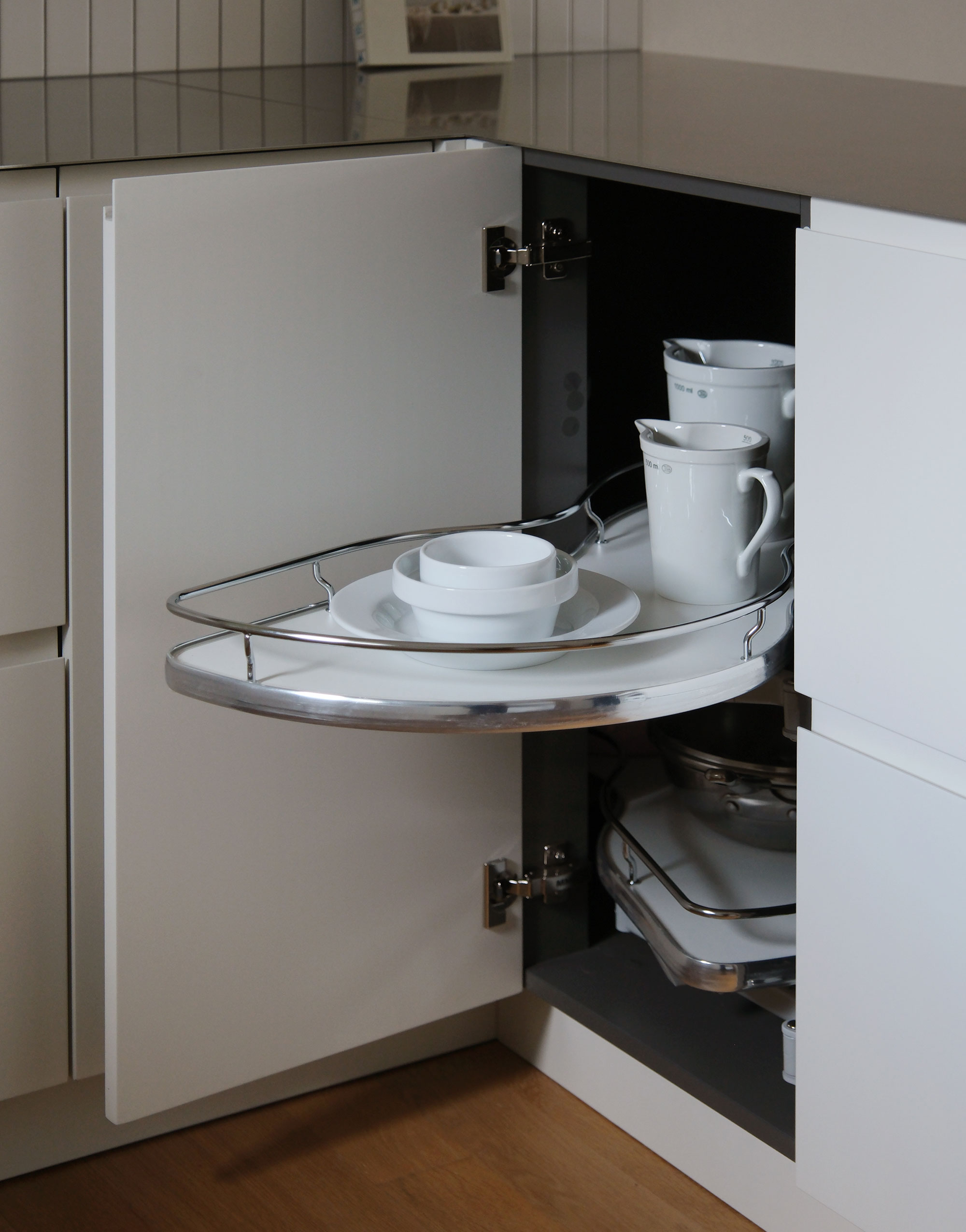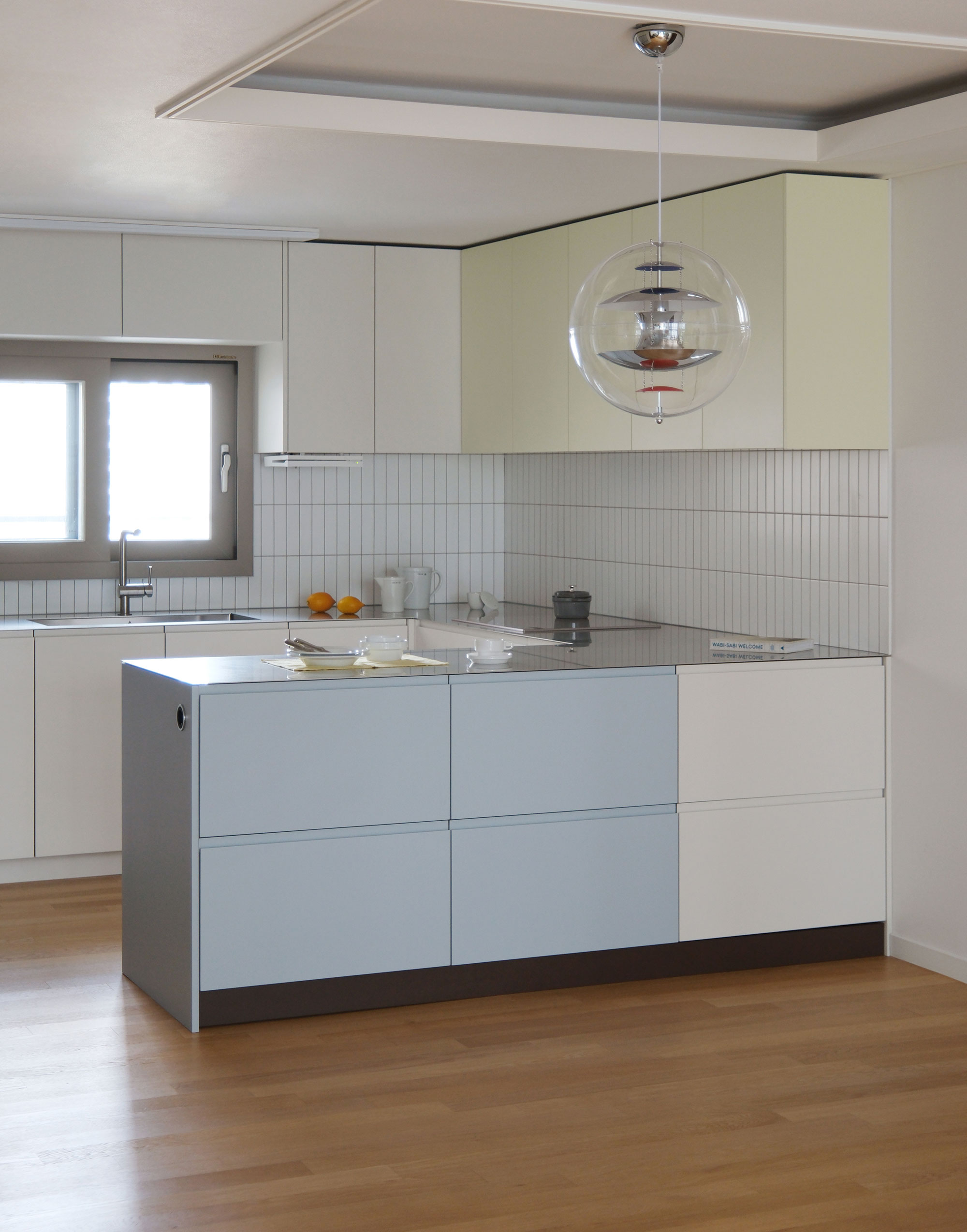 넉넉한 수납을 위해 상부장은 ㄱ자 형태로 설계하고,