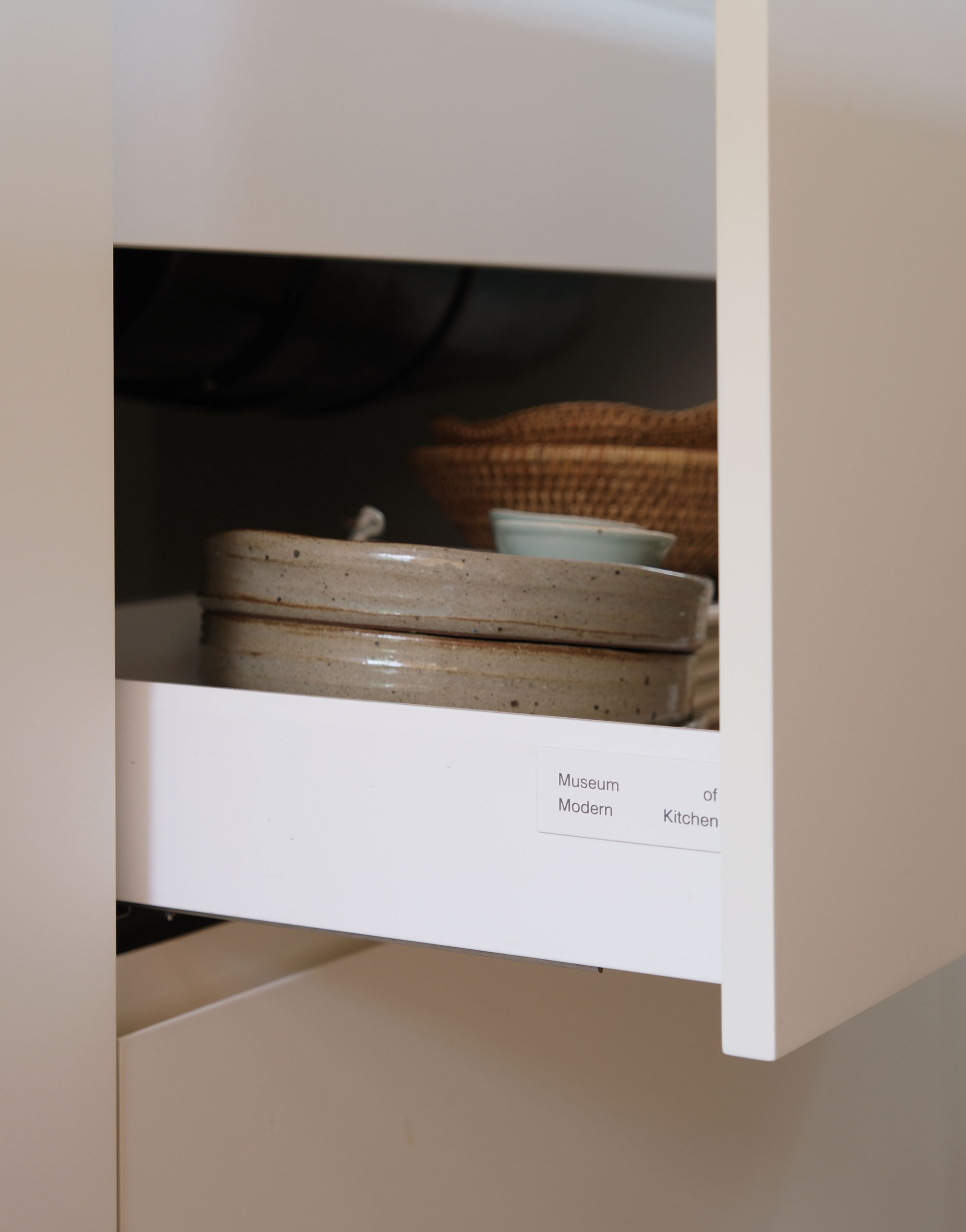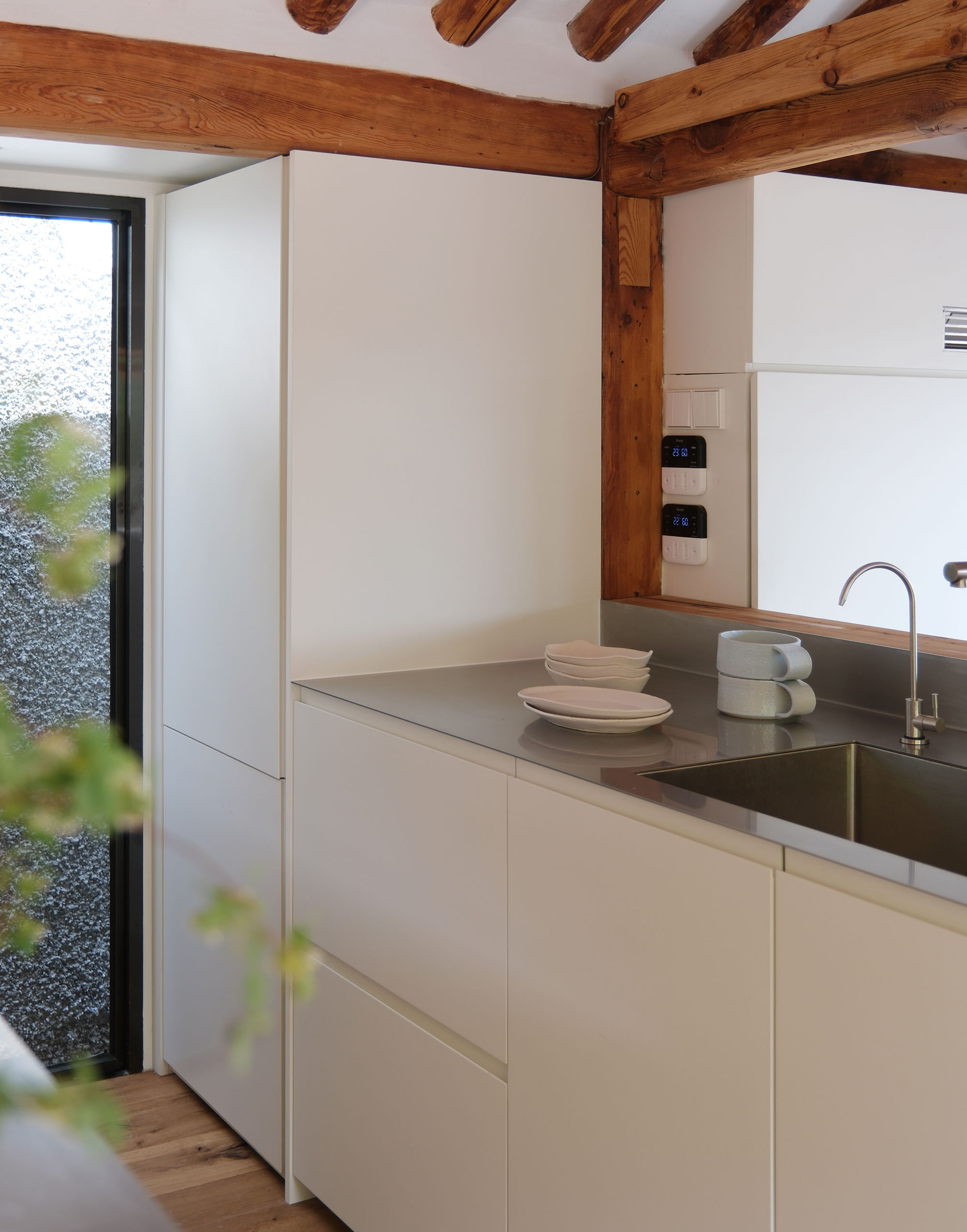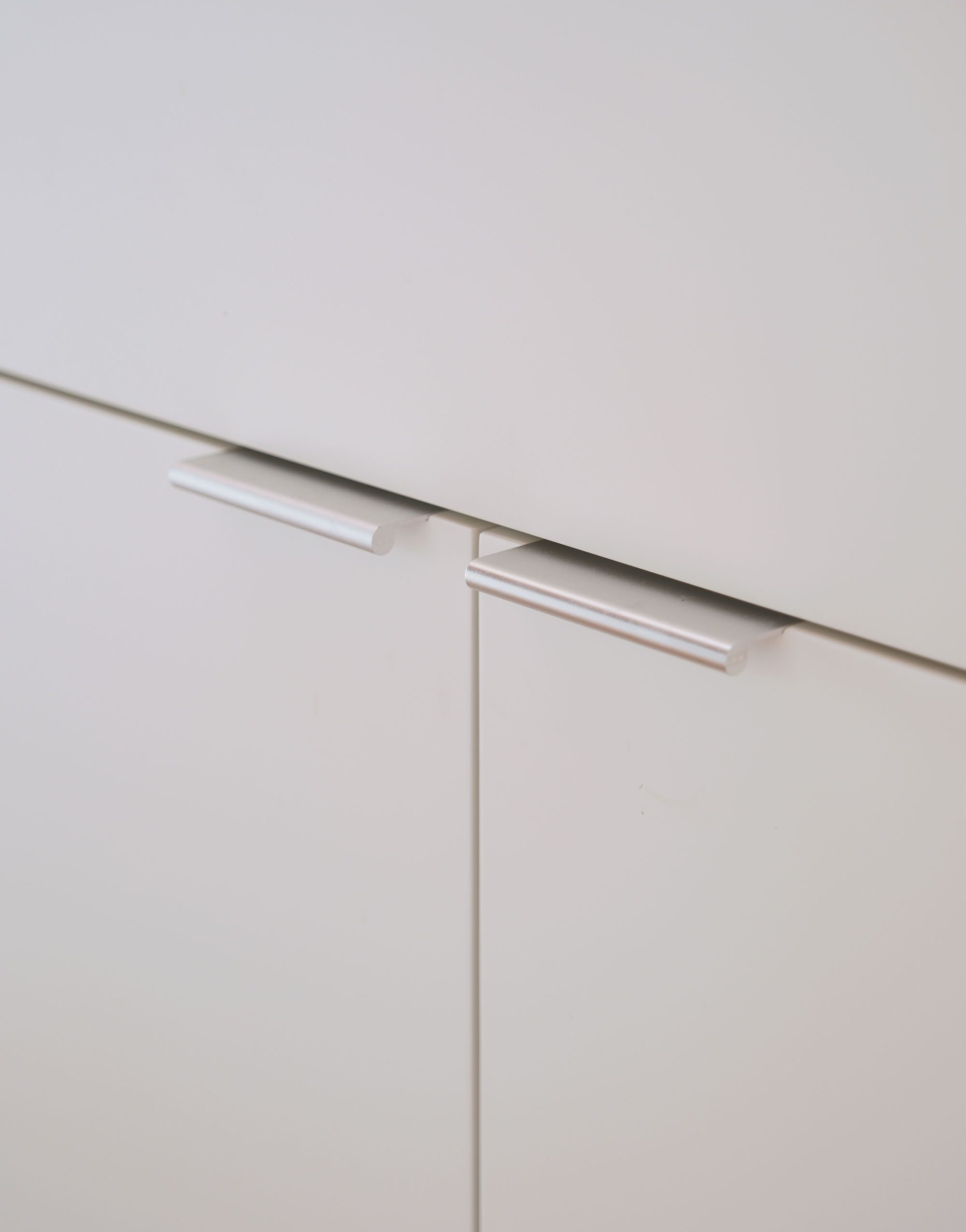 차분한 솔트 화이트 컬러와 실버 핸들, 메탈 마감재는