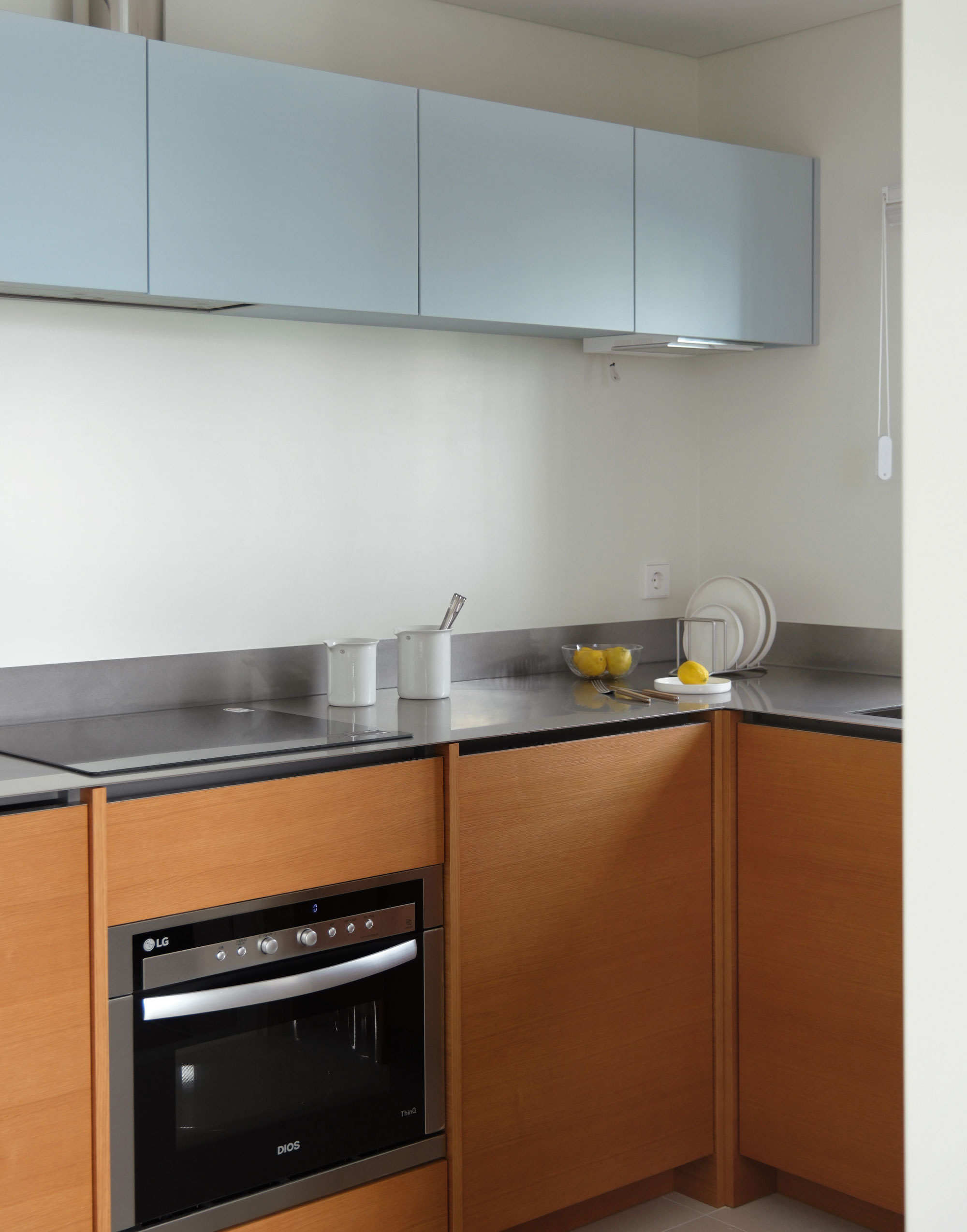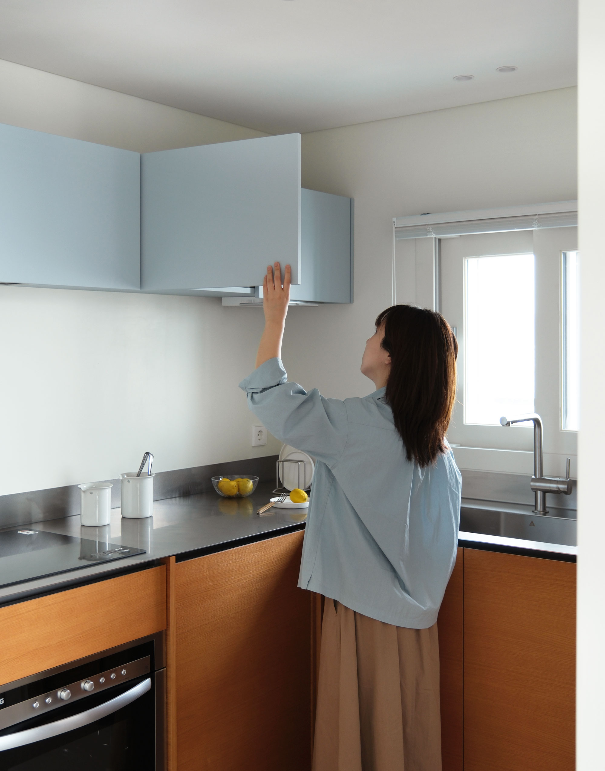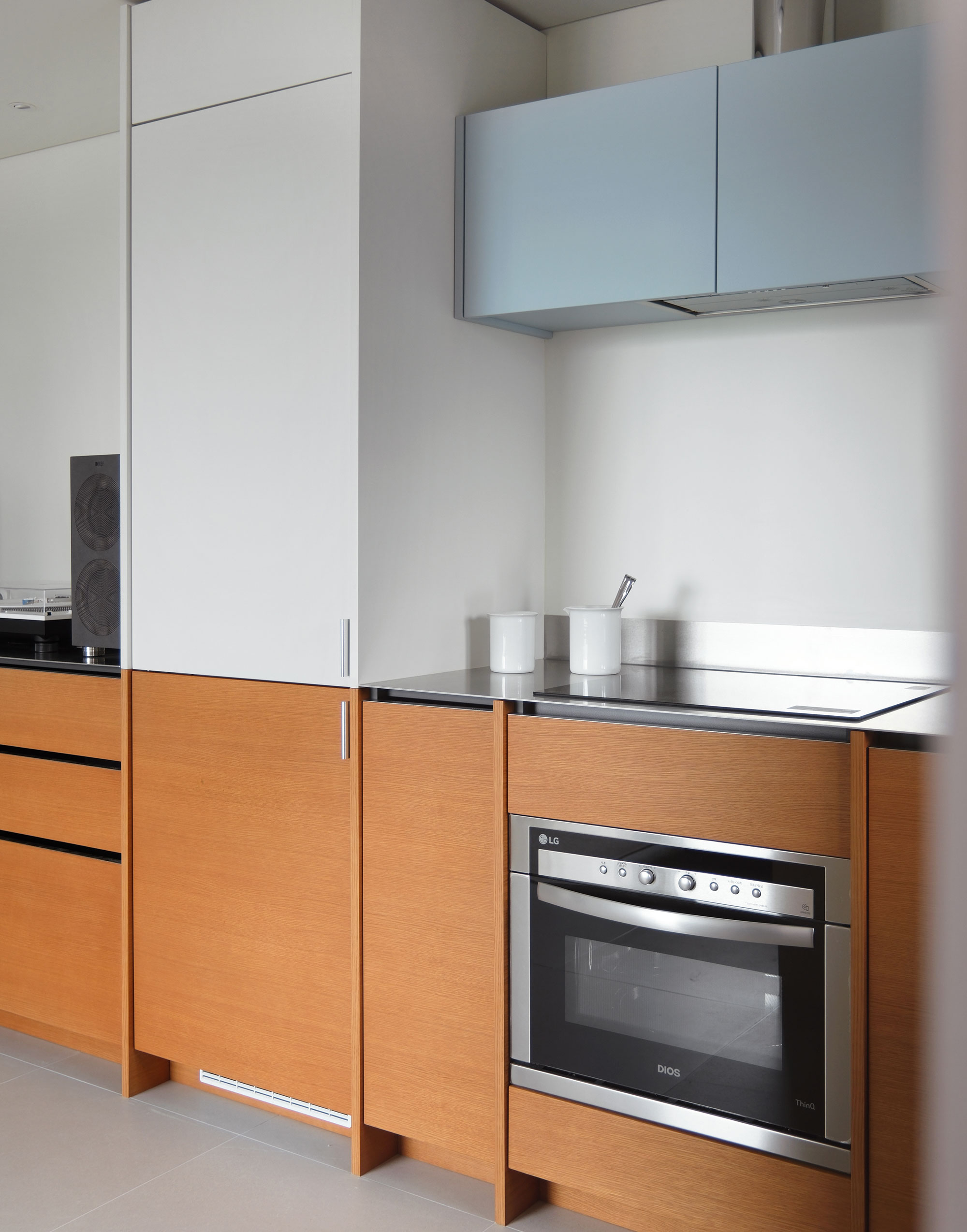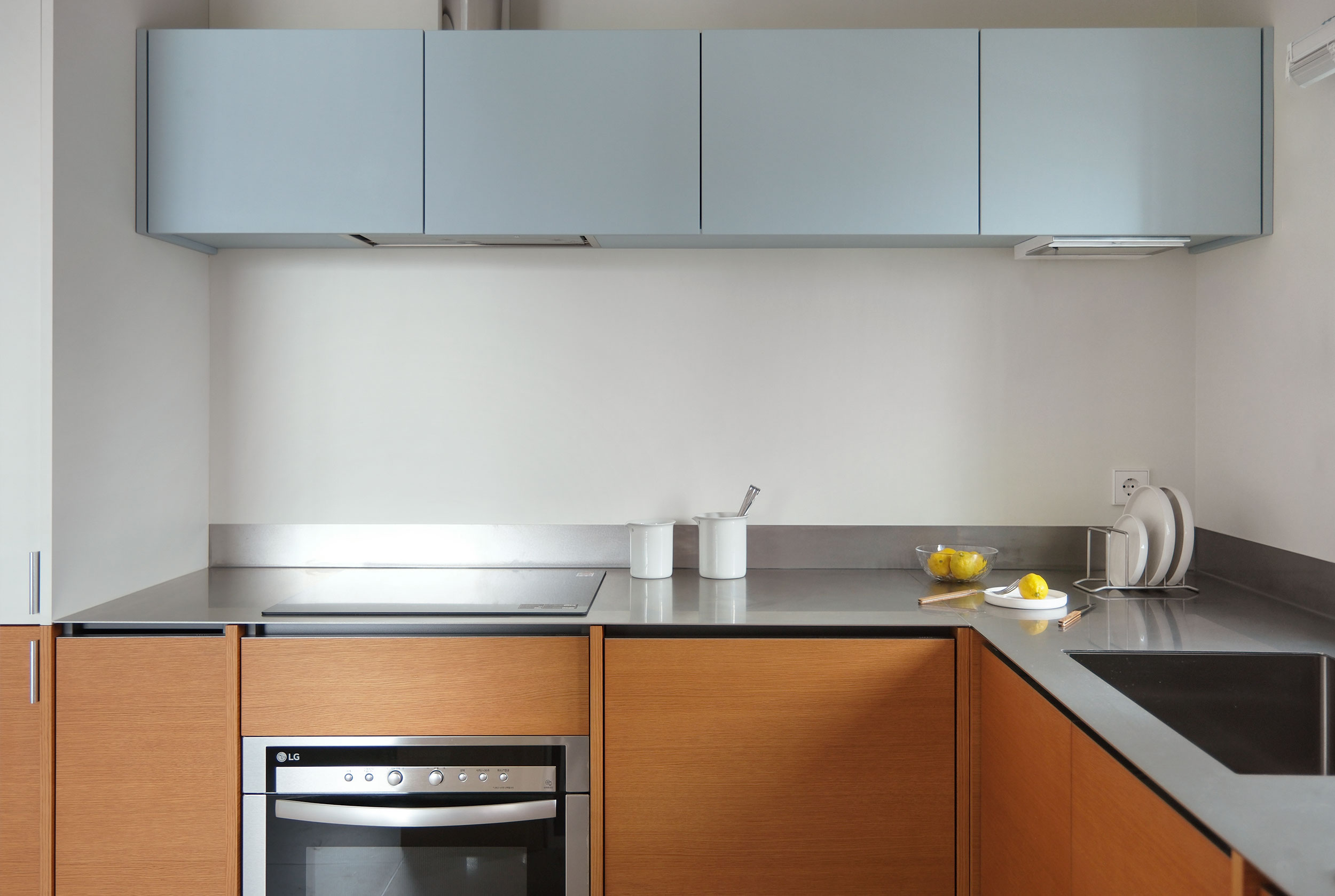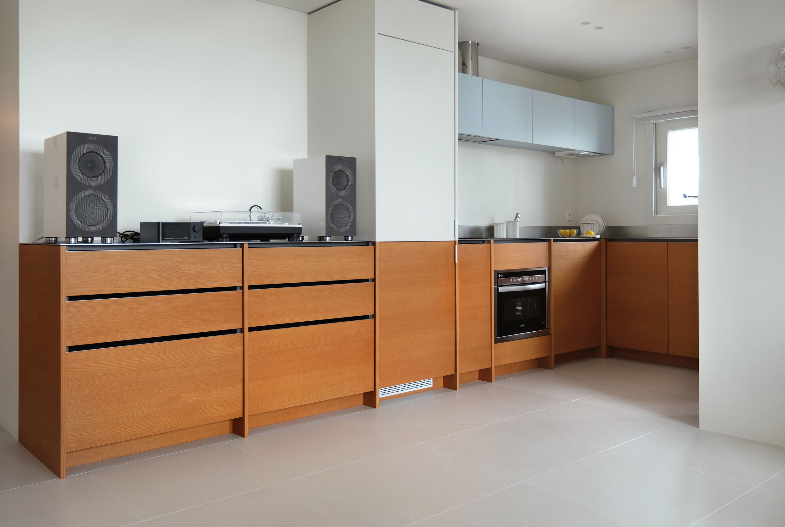 길게 펼쳐진 ㄱ자형 하부장과 그 중심에 놓인 키큰장이