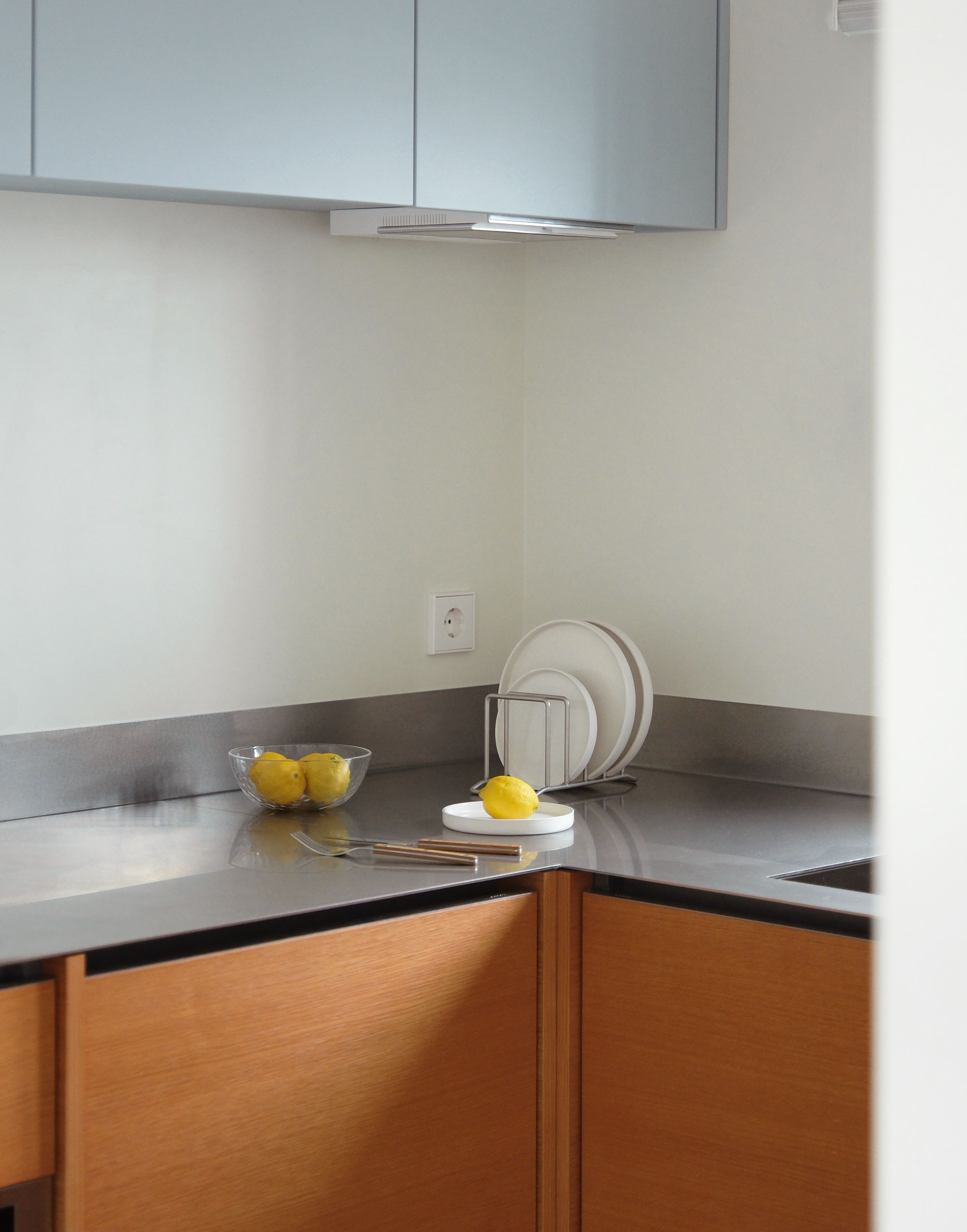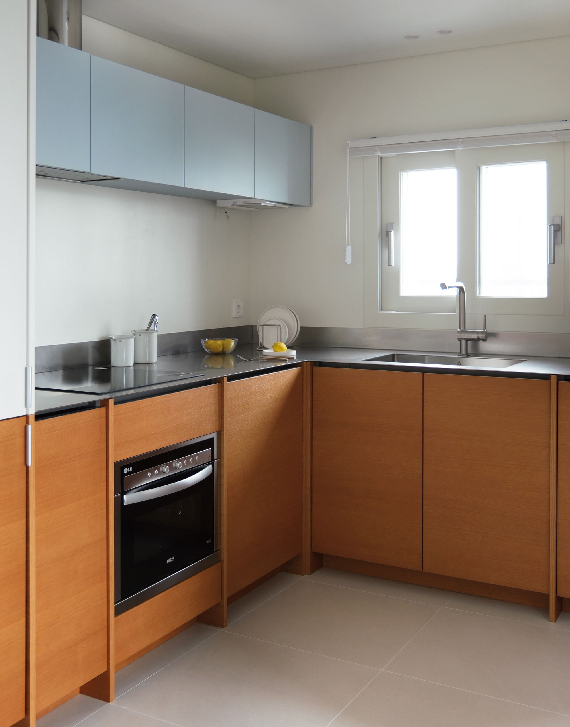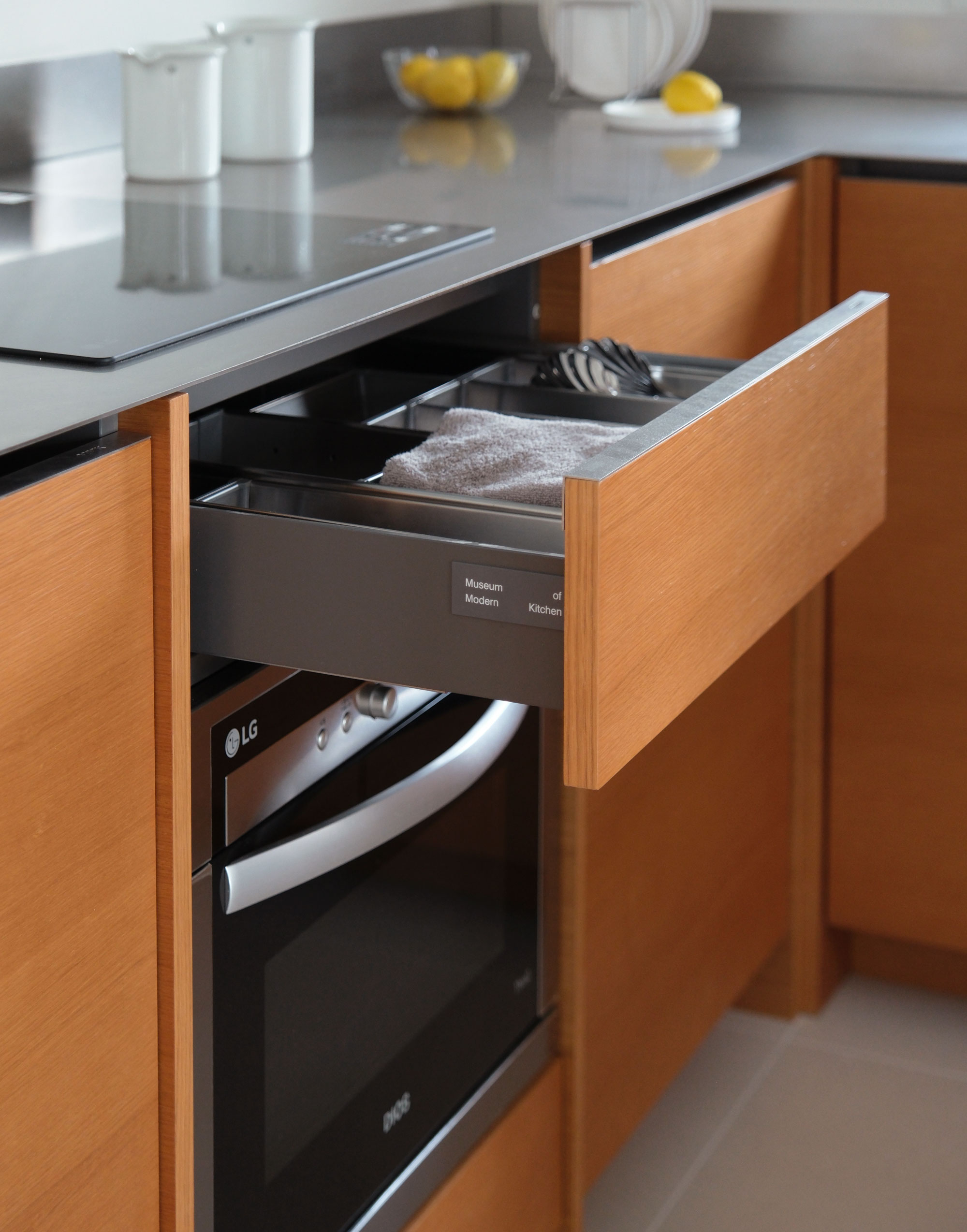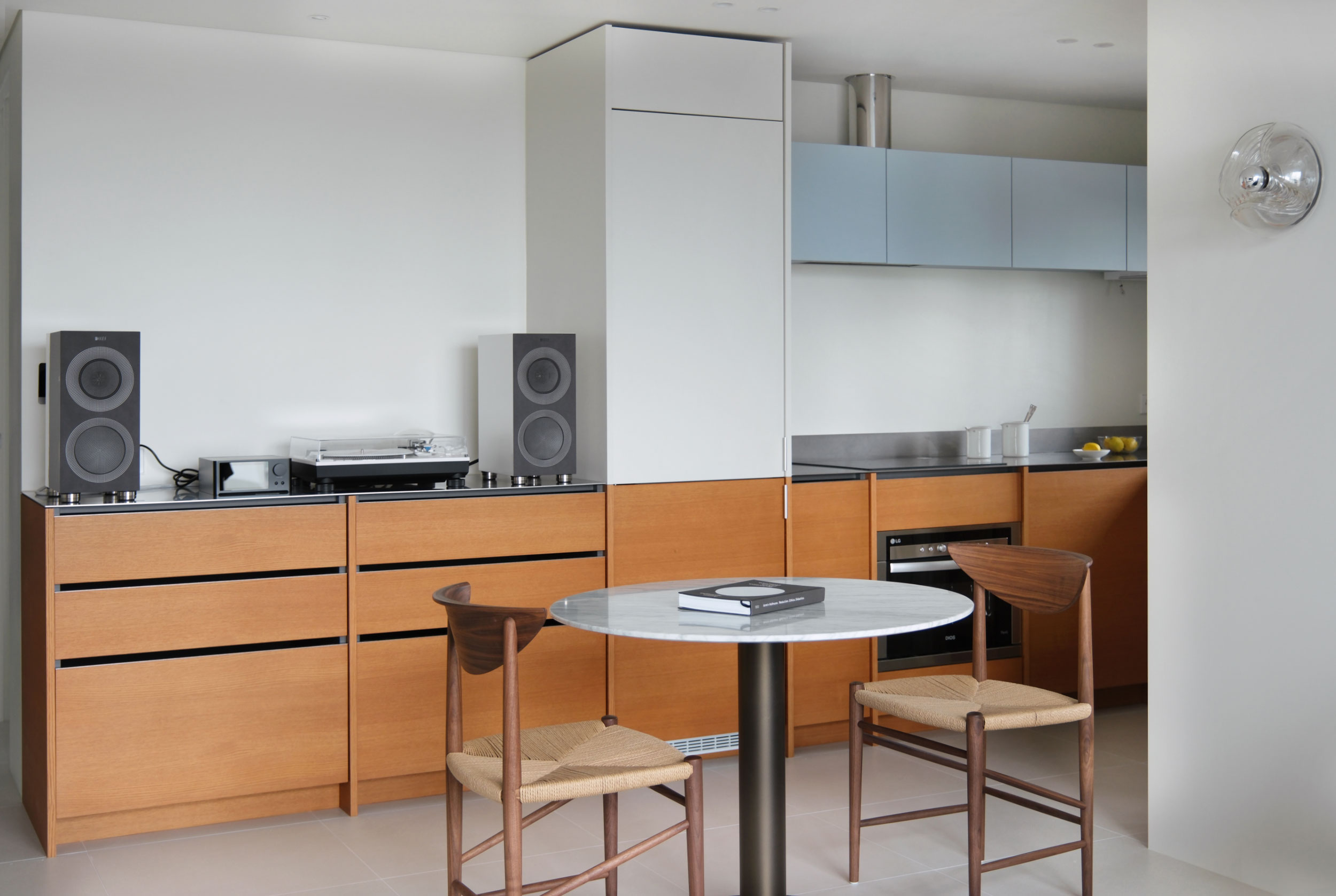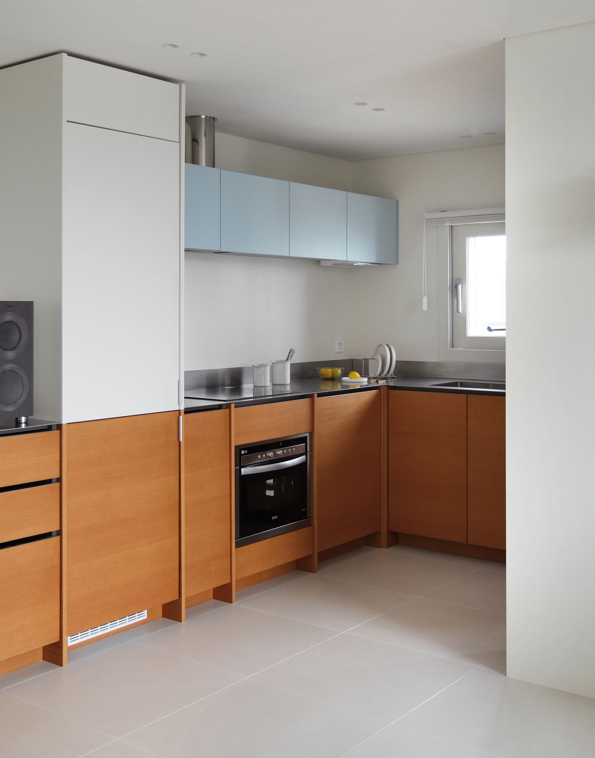 길게 펼쳐진 ㄱ자형 하부장과 그 중심에 놓인 키큰장이