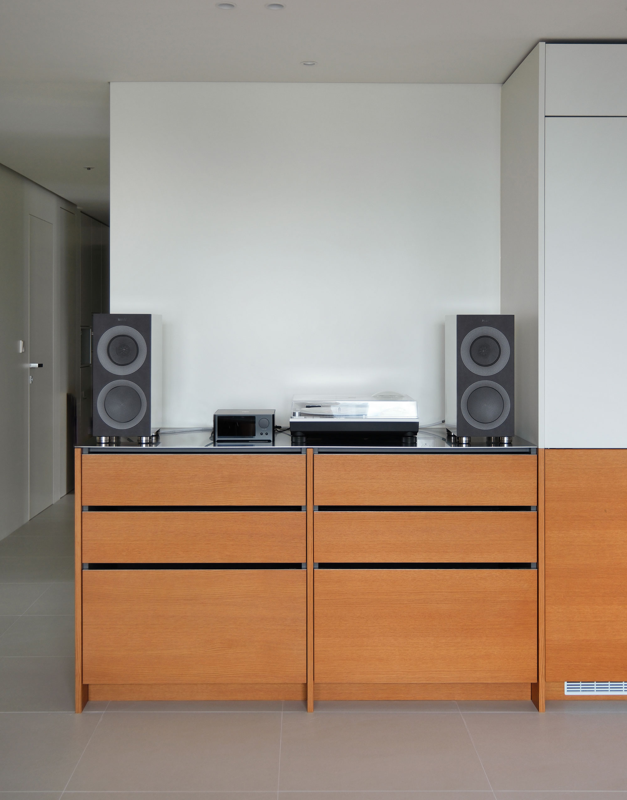 좌측은 오브제와 소형 가전을 위한 생활 수납공간을 배치하고