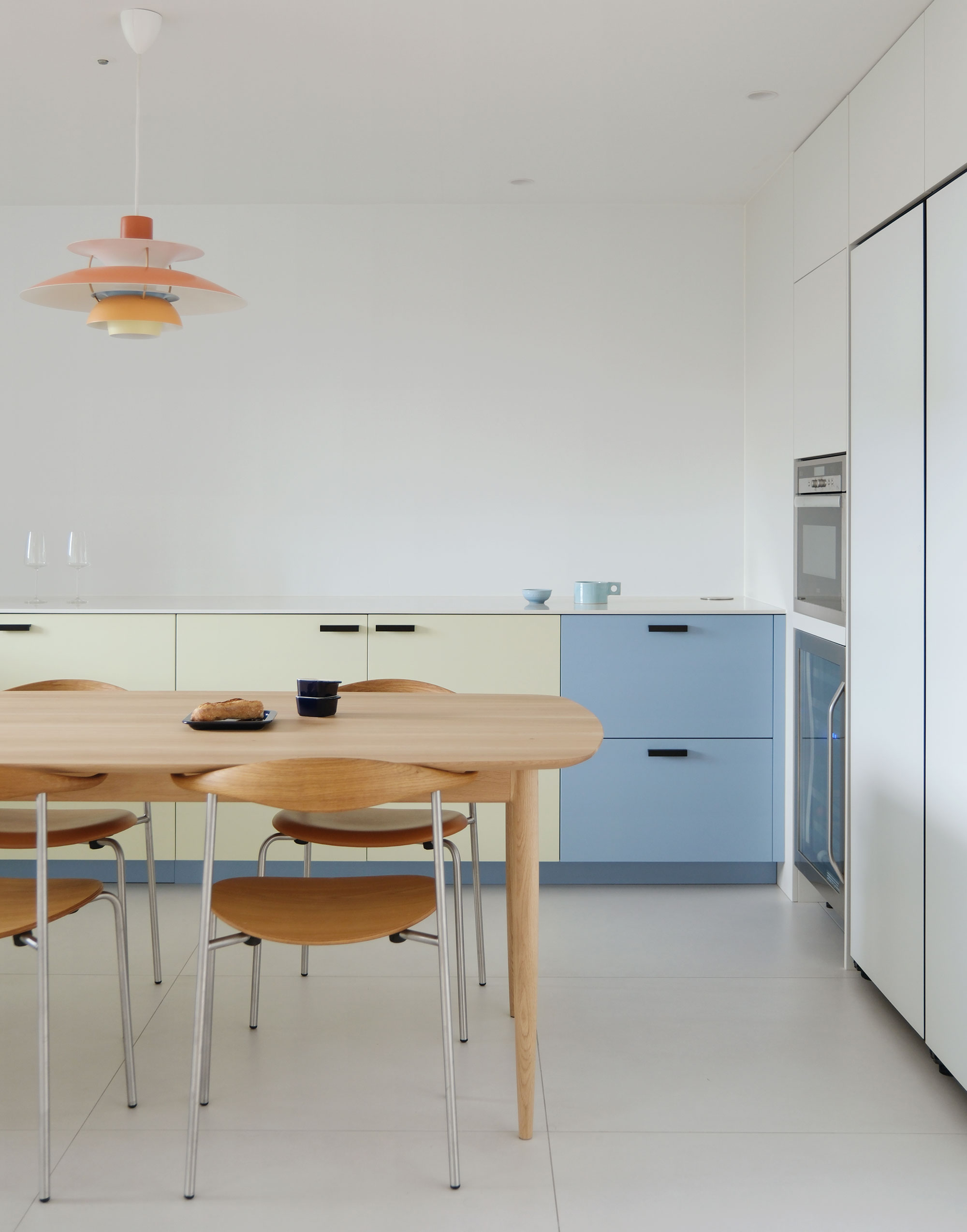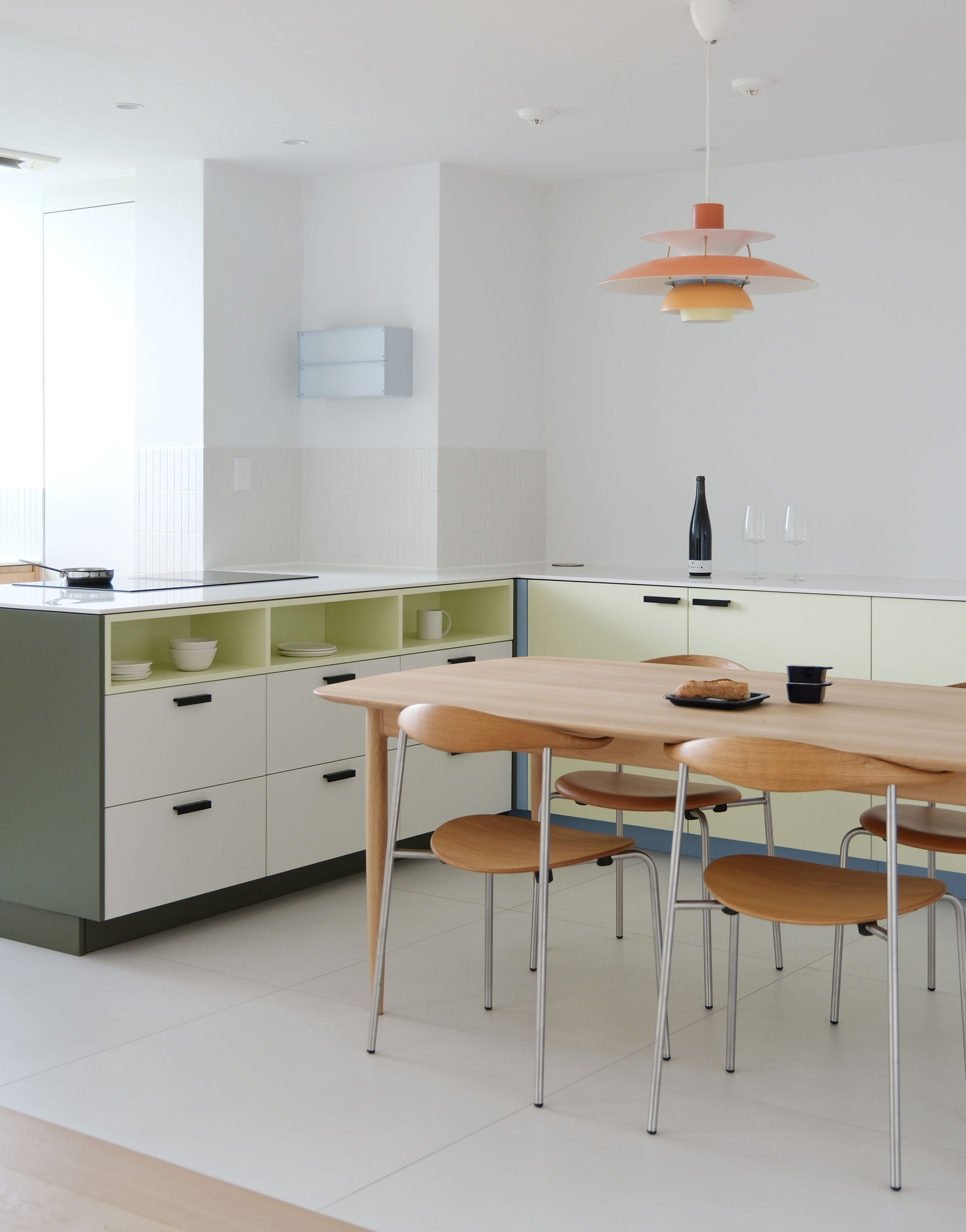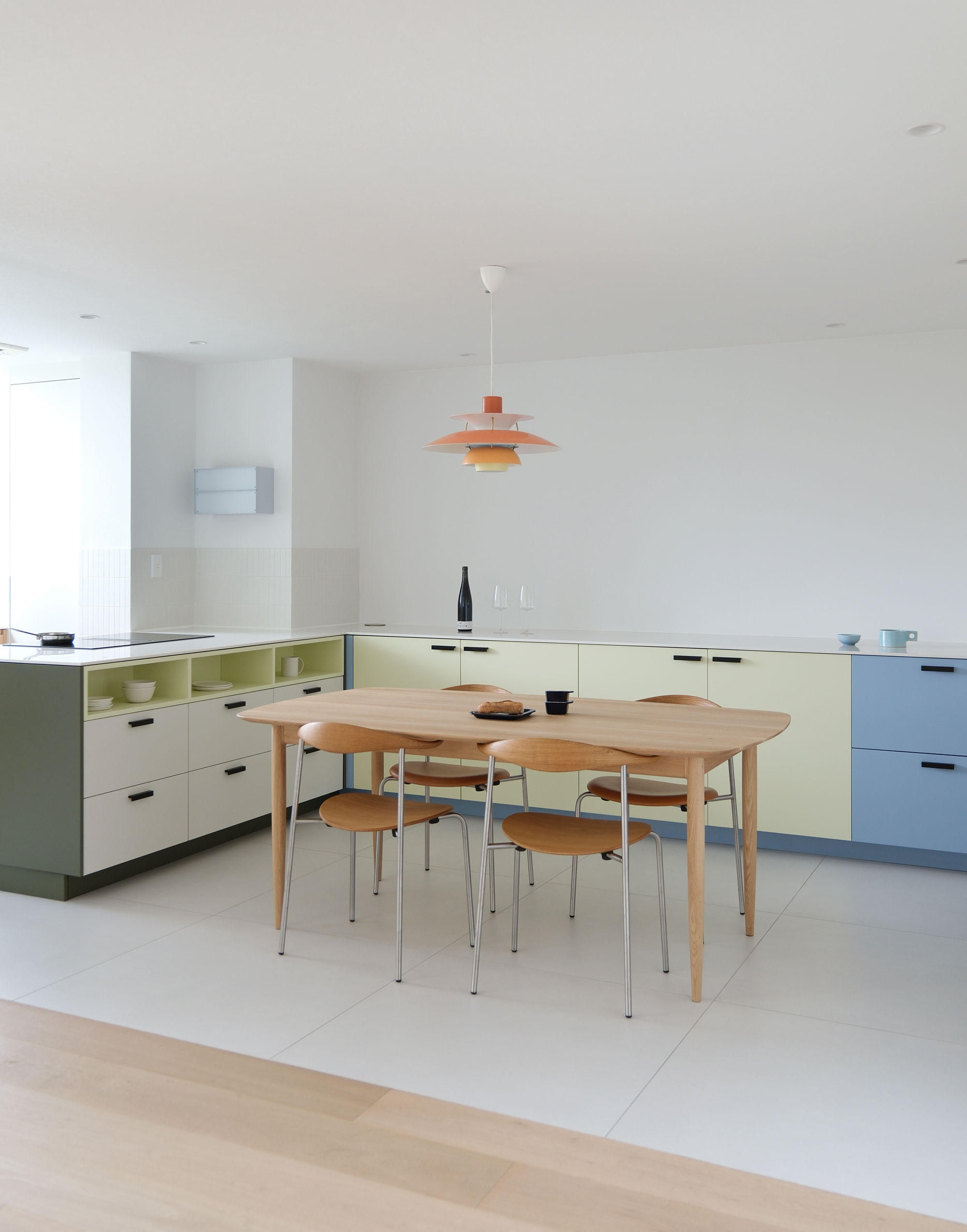 특히 다이닝 공간에서는 경쾌한 컬러가 분위기를 밝히며,